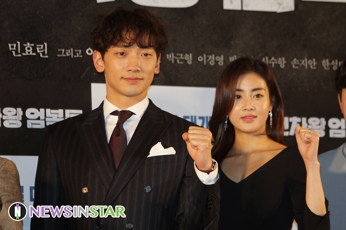 8일 오후, 서울시 송파구 롯데시네마 월드타워에서 영화 ‘자전차왕 엄복동’ 응원단 발대식 쇼케이스가 열려 배우 정지훈(비), 강소라가 참석해 포즈를 취하고 있다.