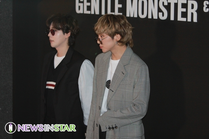 14일 오후 서울시 강남구 가로수길에서 아이웨어 브랜드 '젠틀몬스터(GENTLE MONSTER)'가 새롭게 리뉴얼된 '신사 가로수길 플래그쉽스토어'와 '패러렐' 두 장소에서 2019 컬렉션 '13' 런칭 행사에 위너 강승윤, 김진우가 참석해 포즈를 취하고 있다.