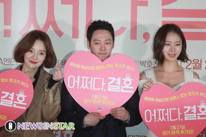 18일 오후, 서울시 용산구 CGV용산아이파크몰에서 영화 '어쩌다 결혼' 언론 시사회 후 기자간담회가 열려 배우 황보라, 김동욱, 고성희가 참석해 포토타임을 갖고 있다.