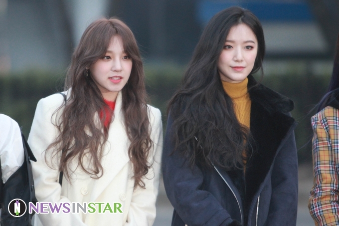 1일 오전 서울시 영등포구 여의도동 KBS 신관 공개홀에서 '뮤직뱅크' 리허설이 열려 (여자)아이들 우기, 슈화가 출근길에 포즈를 취하고 있다.