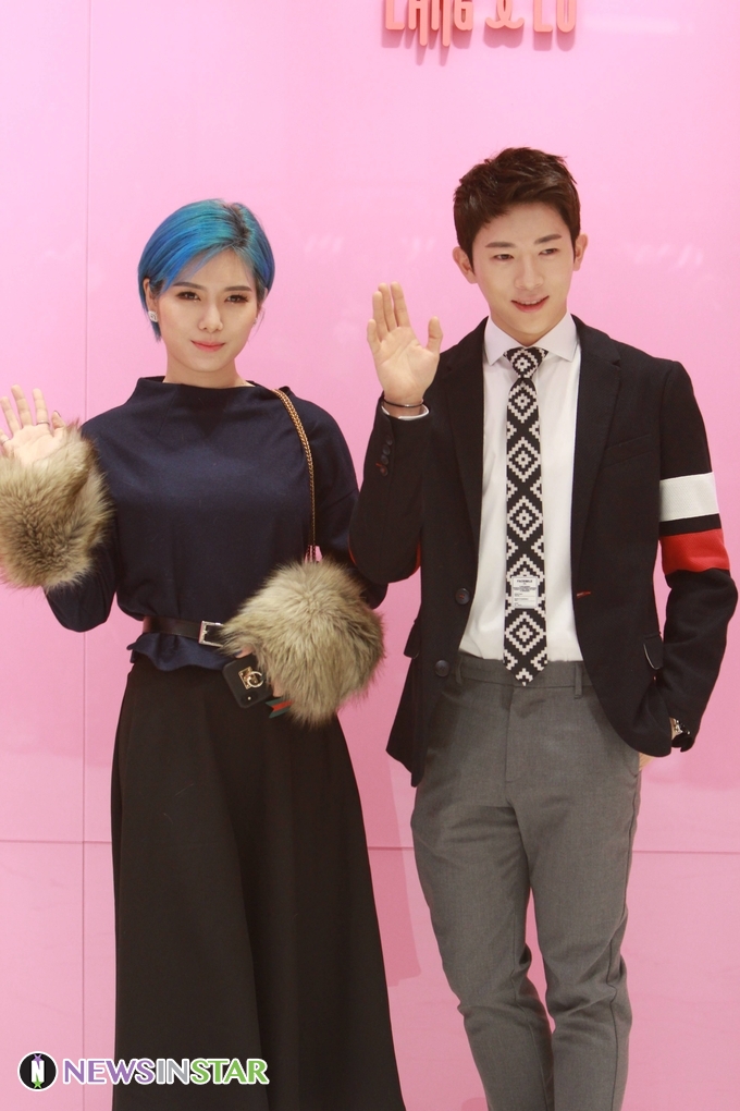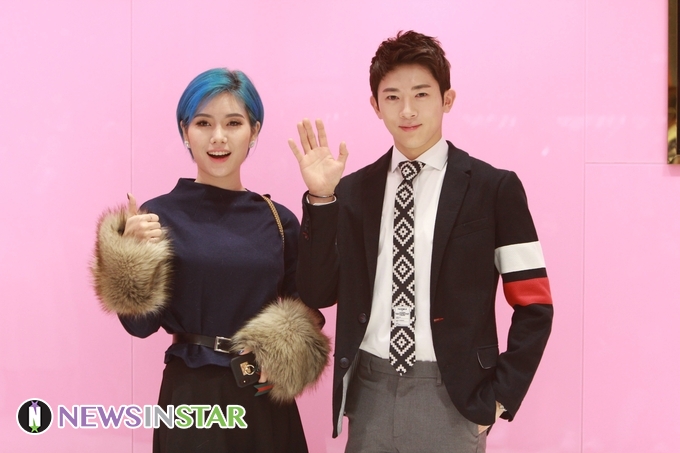 15일 오후 서울 영등포구 여의도 IFC몰에서 브랜드 랭앤루(LANG&LU)의 첫번째 플래그쉽 스토어 오픈행사가 열려 뷰티 크리에이터 꽁지X문군이 참석해 포즈를 취하고 있다.