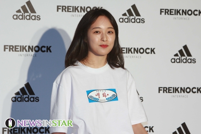 22일 오후 서울시 용산구 전쟁기념관 옥외전시장에서 '프라이노크X아디다스 2019 평화 컬렉션' 행사가 열려 셀럽 김보라가 참석해 포토월에서 포즈를 취하고 있다.