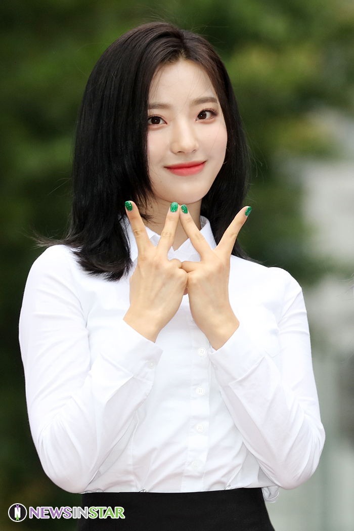 그룹 프로미스나인 이새롬이 14일 오전 서울 영등포구 KBS 신관에서 진행되는 KBS 2TV '뮤직뱅크'리허설에 참석하기 앞서 포즈를 취하고 있다.