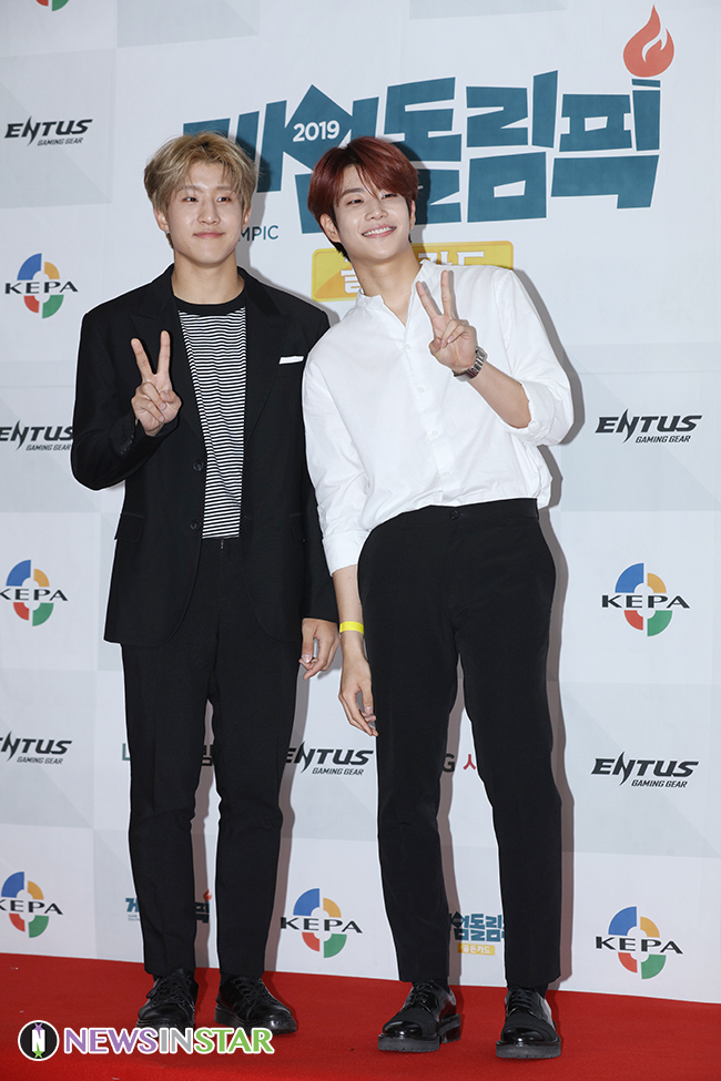 그룹 아스트로 진진, MJ가 17일 오전 서울 마포구 에스플렉스 OGN e스타디움에서 열린 ‘게임돌림픽 2019 : 골든카드’ 레드카펫 행사에서 포즈를 취하고 있다.