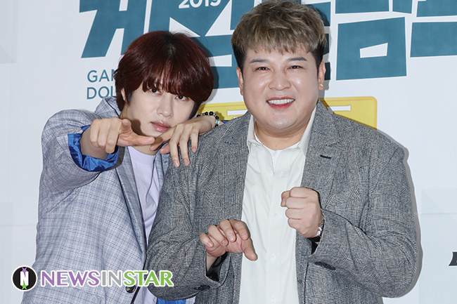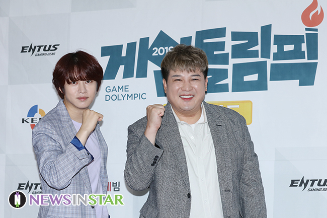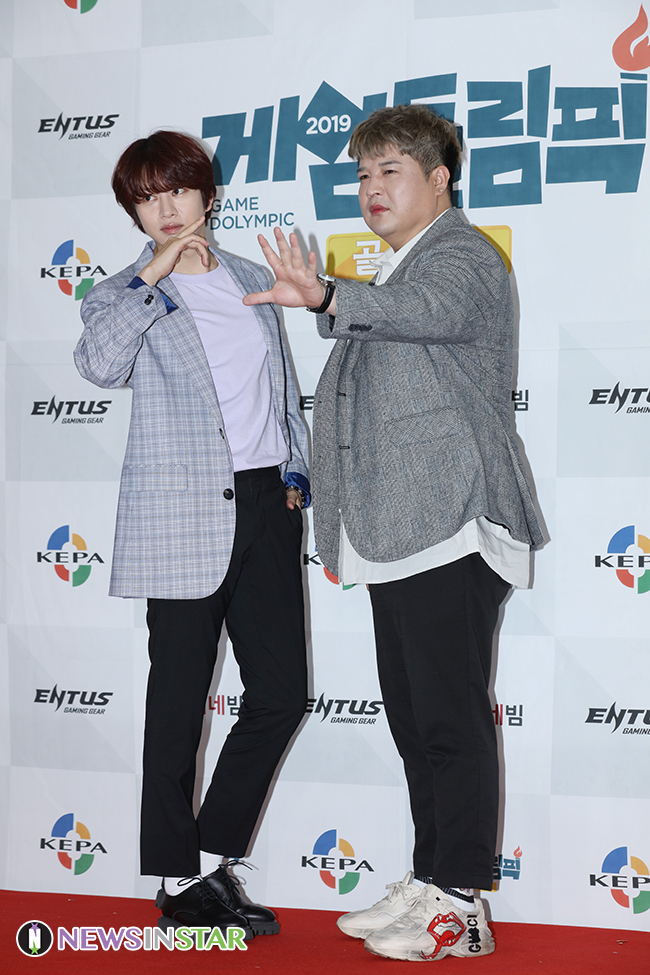 그룹 슈퍼주니어 김희철, 신동이 17일 오전 서울 마포구 에스플렉스 OGN e스타디움에서 열린 ‘게임돌림픽 2019 : 골든카드’ 레드카펫 행사에서 포즈를 취하고 있다.