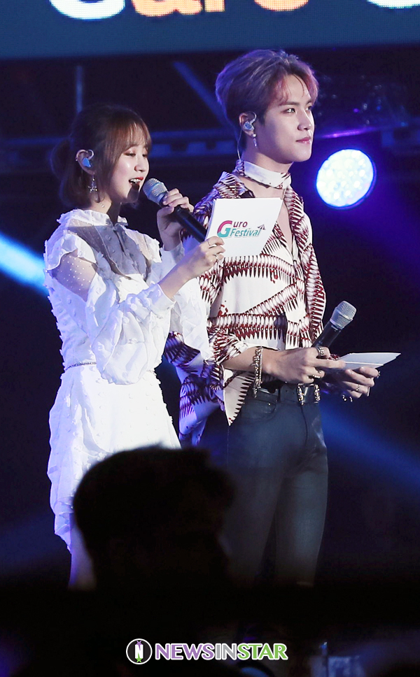 가수 앤씨아와 김동한이 29일 오후 서울 구로구 구로동에 위치한 안양천 특설무대에서 열린 '2019 점프 구로 아시아 문화축제'의 아시아 드림 콘서트에 참석해 MC를 보고 있다.
