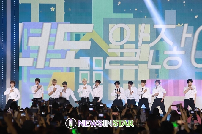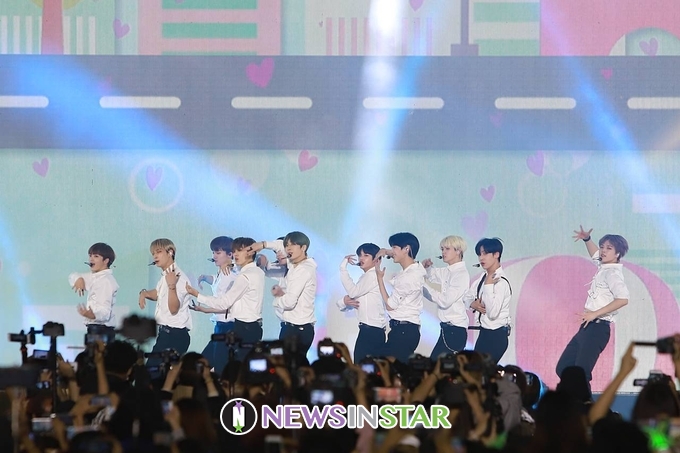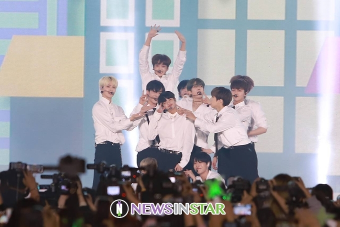 10월 6일 밤 서울시 종로구 광화문광장에서 '제1회 서울 뮤직 페스티벌' 폐막공연인 'SMUF K-POP'이 열려 X1(엑스원)이 '웃을 때 제일 예뻐' 무대를 선보이고 있다.