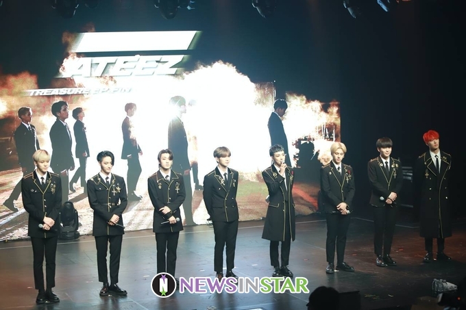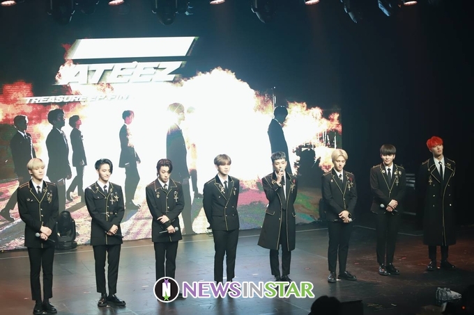 8일 오후 서울시 강남구 청담동 일지아트홀에서 보이 그룹 에이티즈(ATEEZ)의 첫 정규 앨범 'TREASURE EP.PIN : All To Action' 쇼케이스가 열려 에이티즈(홍중, 성화, 윤호, 여상, 산, 민기, 우영, 종호)가 쇼케이스 시작 인사를 하고 있다.