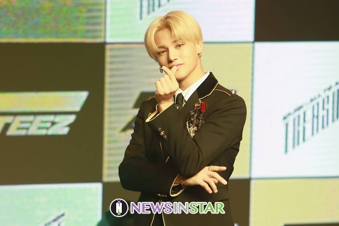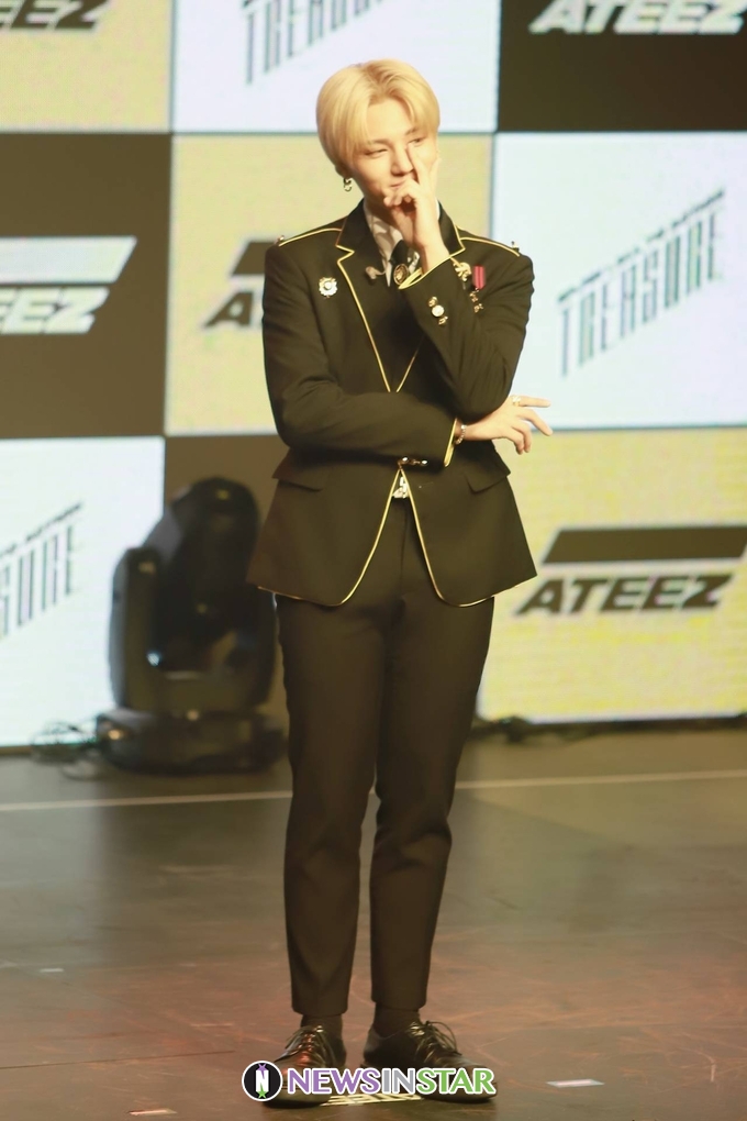 8일 오후 서울시 강남구 청담동 일지아트홀에서 보이 그룹 에이티즈(ATEEZ)의 첫 정규 앨범 'TREASURE EP.PIN : All To Action' 쇼케이스가 열려 에이티즈(홍중, 성화, 윤호, 여상, 산, 민기, 우영, 종호) 우영이 포토타임을 갖고 있다.
