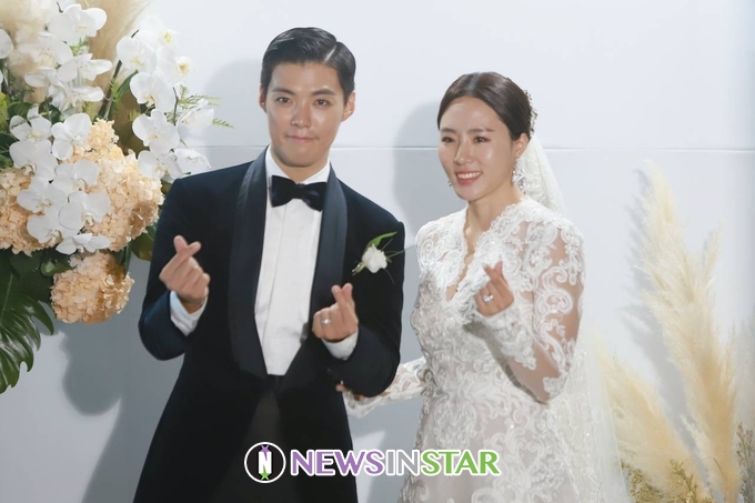 12일 오전 서울시 광진구 광장동 비스타 워커힐 서울에서 가수  강남과 전 스피드 스케이트 선수 이상화 결혼식이 열려 새 신랑 강남과 신부 이상화가 결혼식 후 포토타임을 갖고 있다.