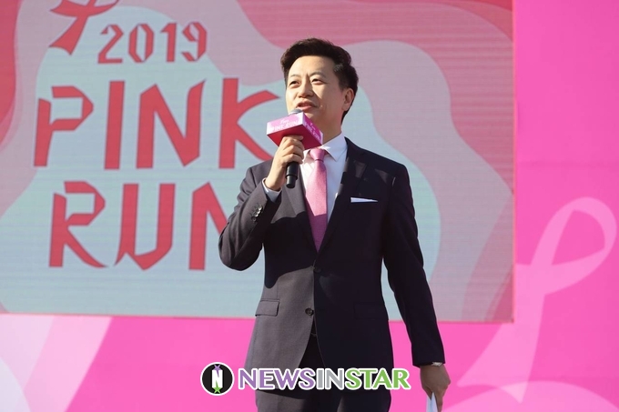 13일 오전 서울시 영등포구 여의도공원에서 '2019 핑크런' 서울 대회가 열려 신영일 아나운서가 사전 행사를 진행하고 있다.