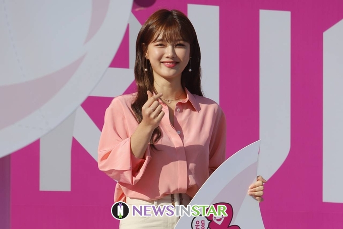 13일 오전 서울시 영등포구 여의도공원에서 '2019 핑크런' 서울 대회가 열려 배우 김유정이 참석해 사전 행사를 진행하고 있다.