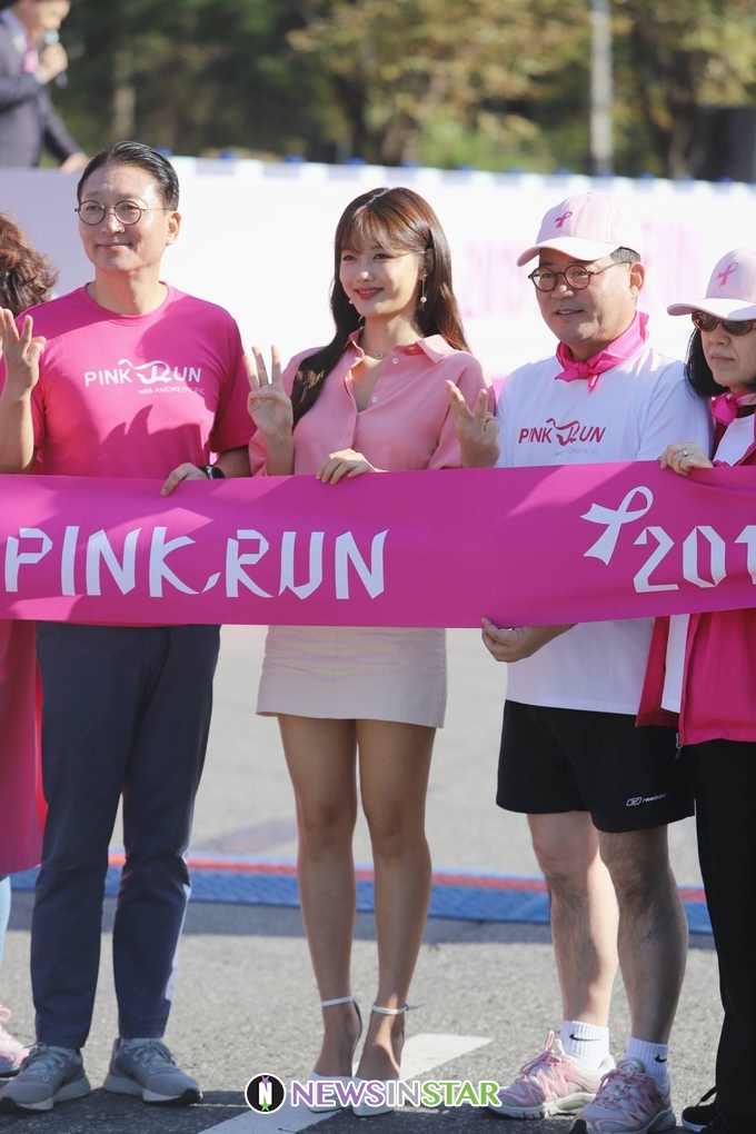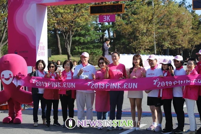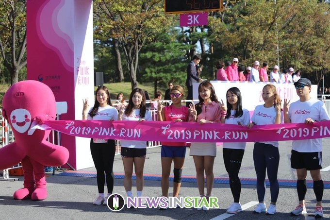 13일 오전 서울시 영등포구 여의도공원에서 '2019 핑크런' 서울 대회가 열려 배우 김유정이 참석해 러닝 출발 전 출발선에서 포토타임을 갖고 있다.