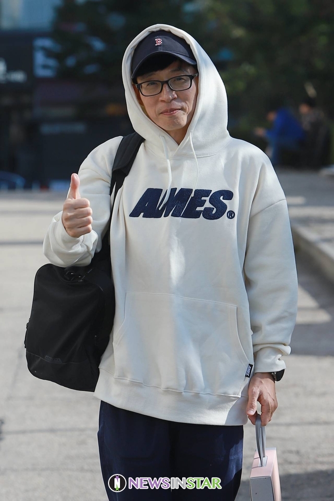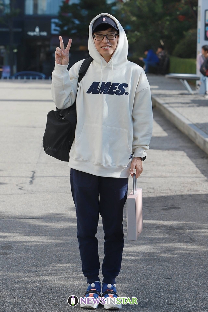 이날 유재석이 출근길에 포즈를 취하고 있다.