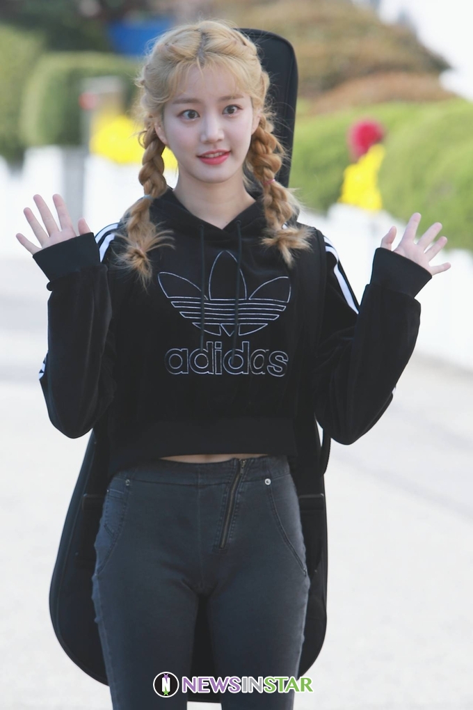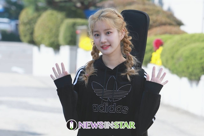 이날 이유비가 출근길에 포즈를 취하고 있다.