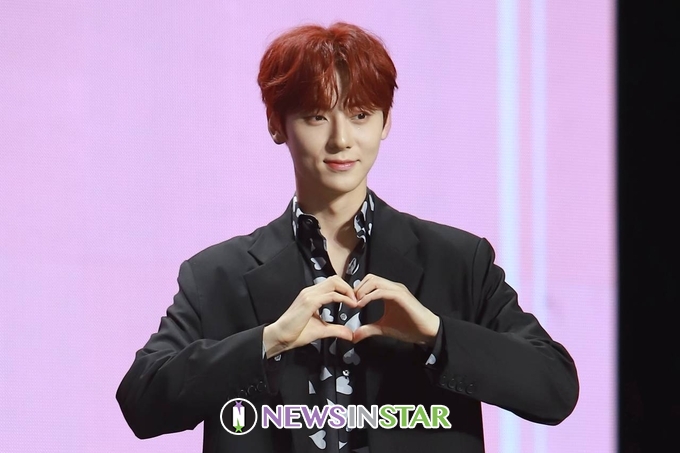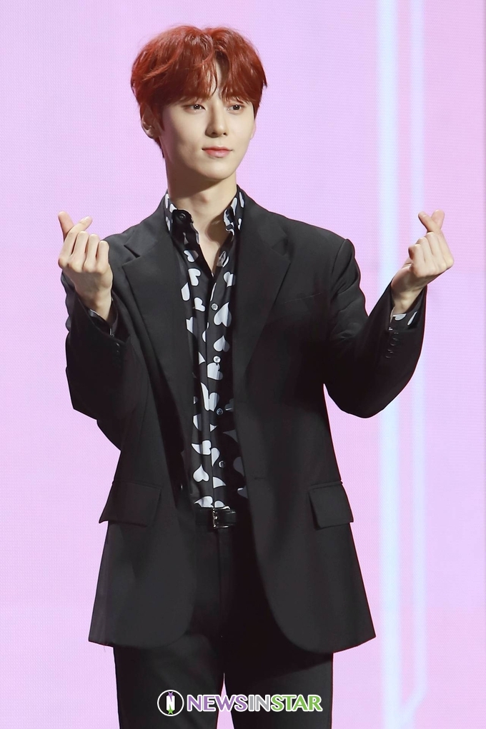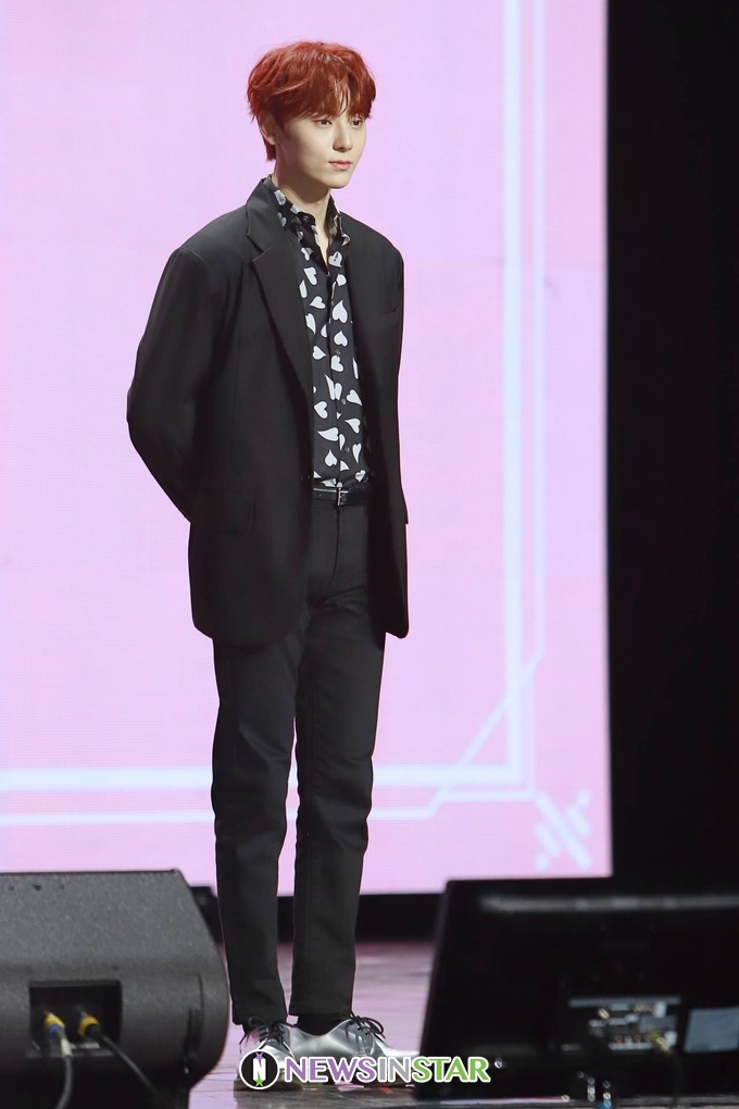 21일 오후 서울시 동대문구 회기동 경희대학교 평화의 전당에서 '뉴이스트(NU'EST)' 일곱번째 미니앨범 'The Table(더 테이블)' 발매 기념 쇼케이스가 열려 민현이 포토타임을 갖고 있다.