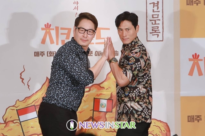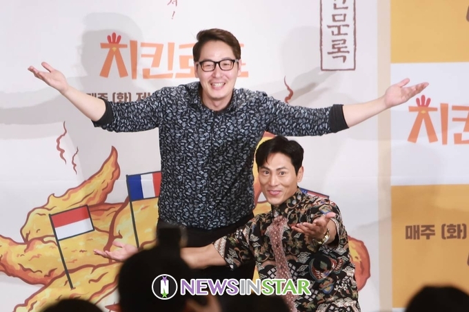 22일 오후 서울시 영등포구 여의도 켄싱턴호텔에서 Olive 채널의 '치킨로드' 기자간담회가 열려 김풍, 김재우가 참석해 포토타임을 갖고 있다.