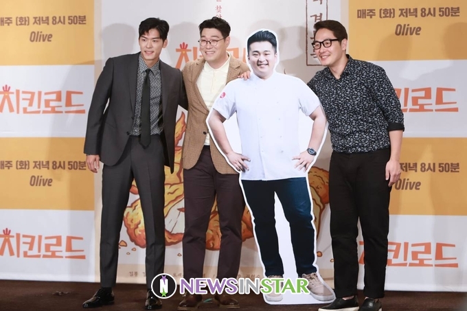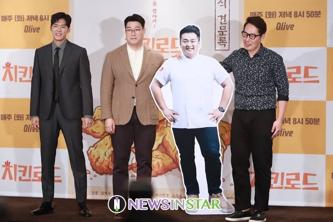 22일 오후 서울시 영등포구 여의도 켄싱턴호텔에서 Olive 채널의 '치킨로드' 기자간담회가 열려 오스틴강, 오세득, 김풍과 이원일 셰프는 등신대로 참석해 포토타임을 갖고 있다.
