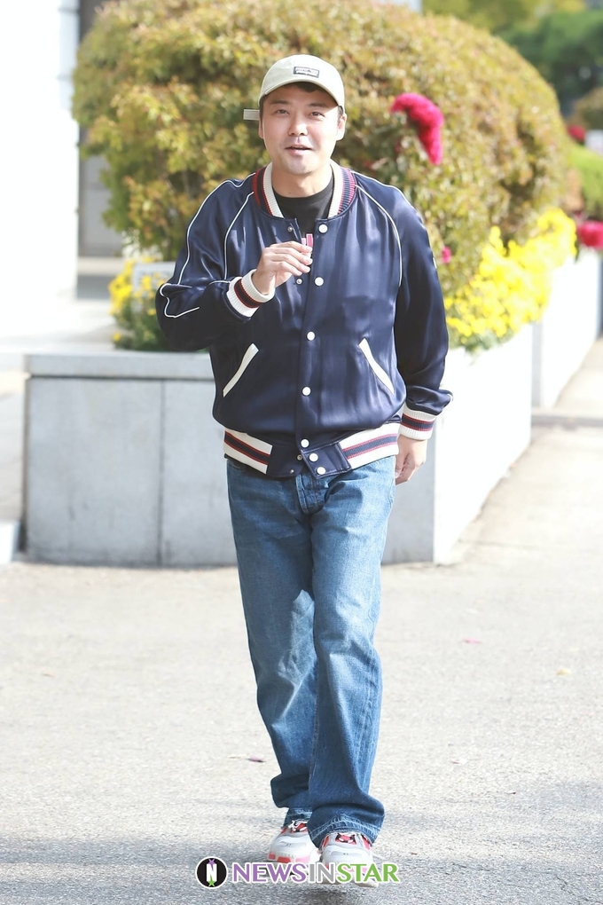 이날 전현무가 출근길에 포즈를 취하고 있다.