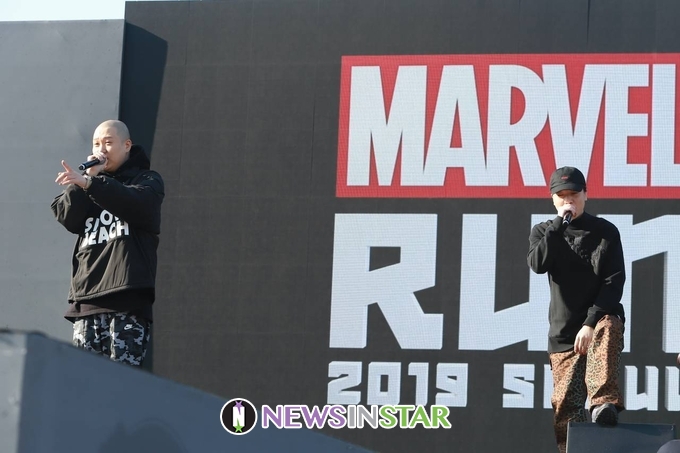 27일 오전 서울시 영등포구 여의도공원 문화의 마당에서 월트디즈니 컴퍼니 코리아의 마블 테마 러닝 행사인 '마블런 2019'가 열려 축하공연으로 딥플로우와 넉살이 무대를 펼치고 있다.