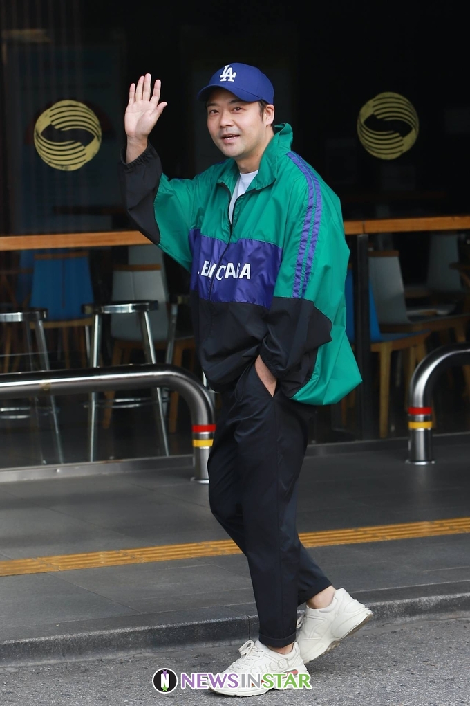 이날 전현무가 출근길에 포즈를 취하고 있다.