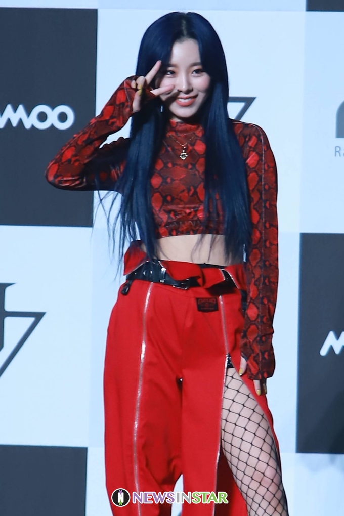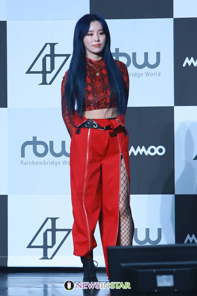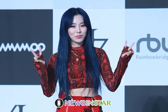 14일 오후 서울시 동대문구 회기동 경희대학교 평화의전당에서 걸그룹 마마무(MAMAMOO)의 두 번째 정규앨범 'reality in BLACK' 발매 기념 컴백 쇼케이스가 열려 휘인이 포토타임을 갖고 있다.