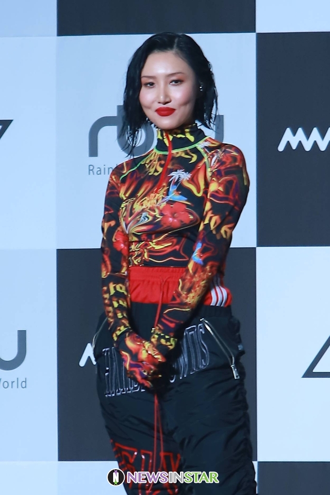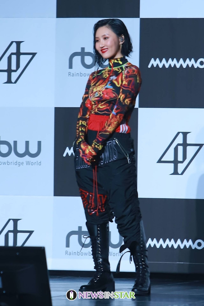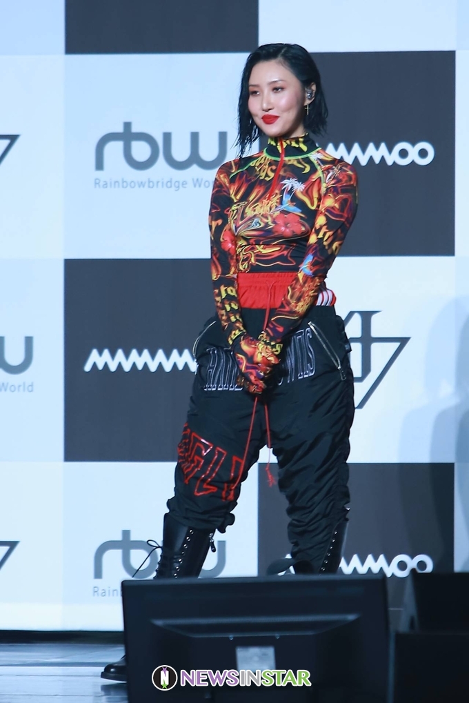 14일 오후 서울시 동대문구 회기동 경희대학교 평화의전당에서 걸그룹 마마무(MAMAMOO)의 두 번째 정규앨범 'reality in BLACK' 발매 기념 컴백 쇼케이스가 열려 화사가 포토타임을 갖고 있다.