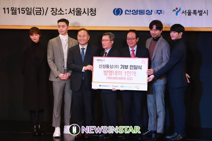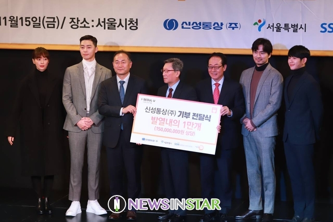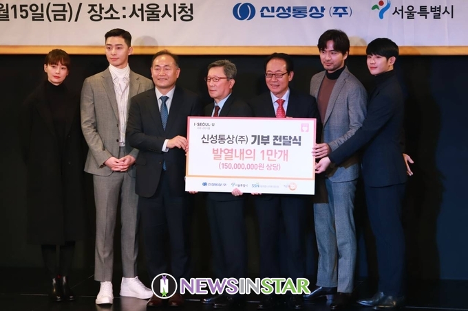 15일 오전 서울시 중구 태평로1가 서울시청에서 패션기업 신성통상의 천연 발열내의 온에어(ON Air) 기부 전달식 행사가 열려 신성통상 브랜드 모델 이나영, 이진욱, 박서준, 정해인이 참석해 발열 내의 전달식 행사를 가졌다.