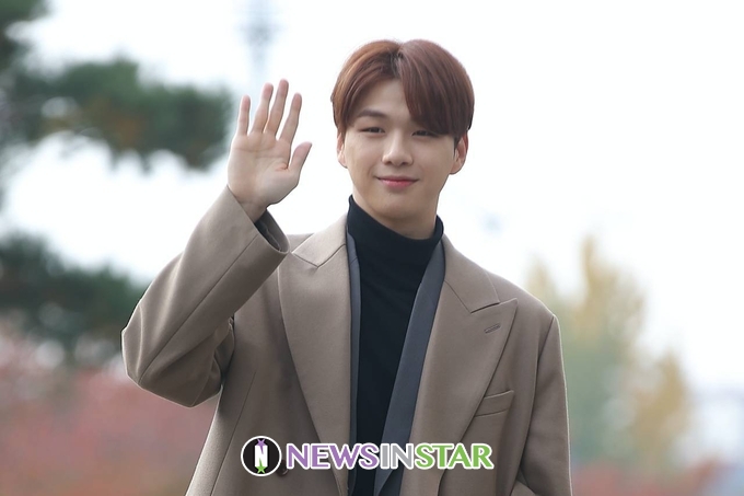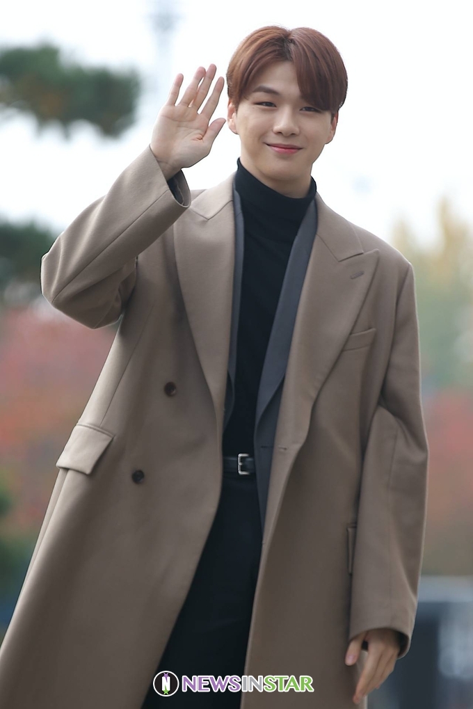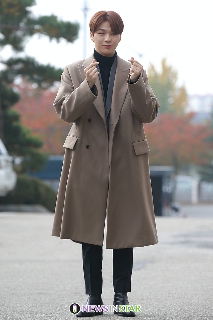 이날 강다니엘이 출근길에 포즈를 취하고 있다.