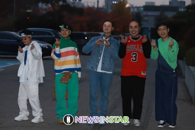 이날 마흔파이브가 출근길에 포즈를 취하고 있다.