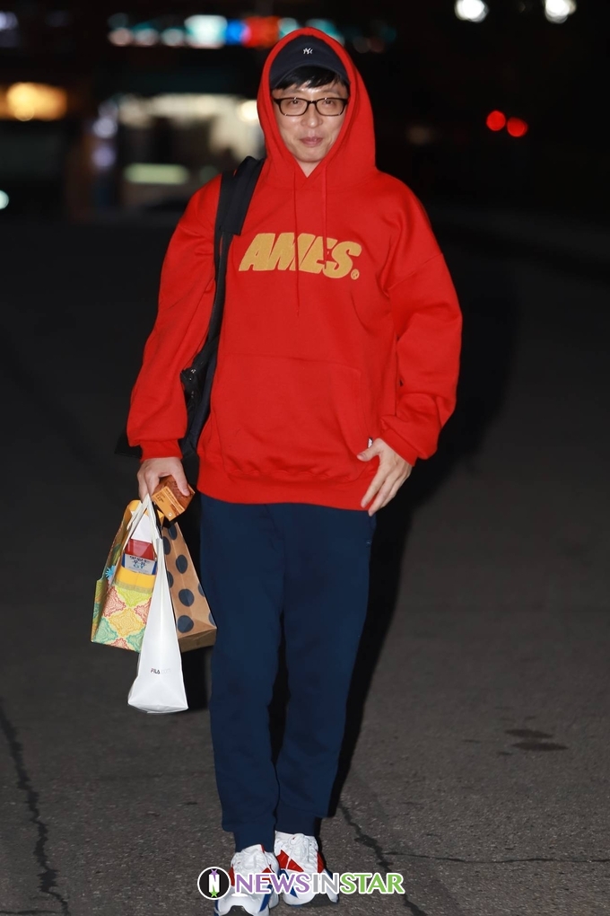이날   유재석이  출근길에 포즈를 취하고 있다.