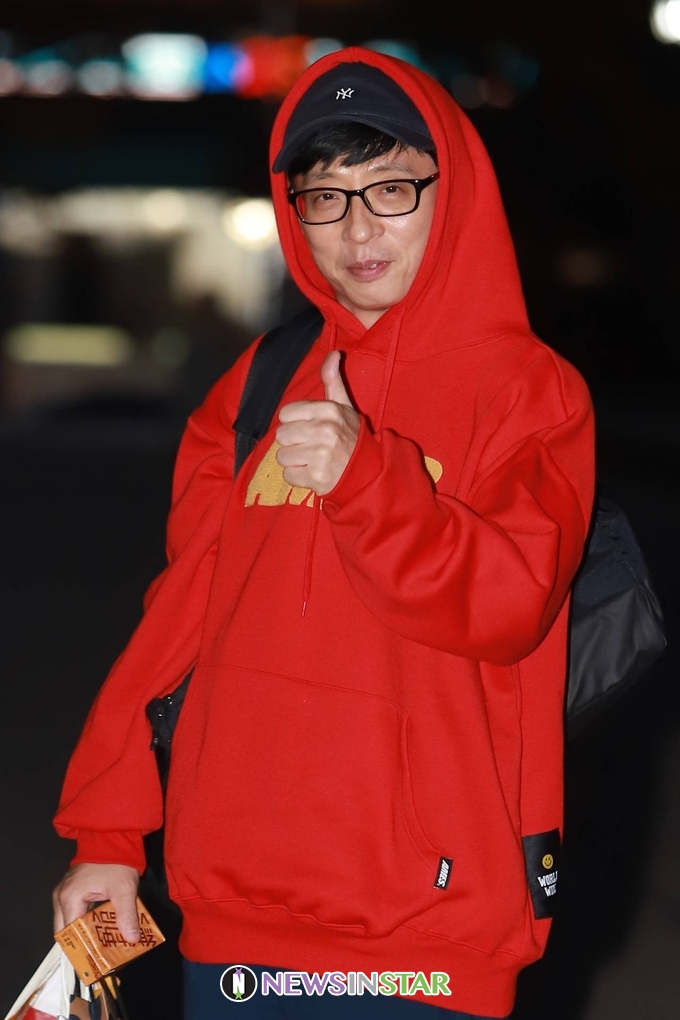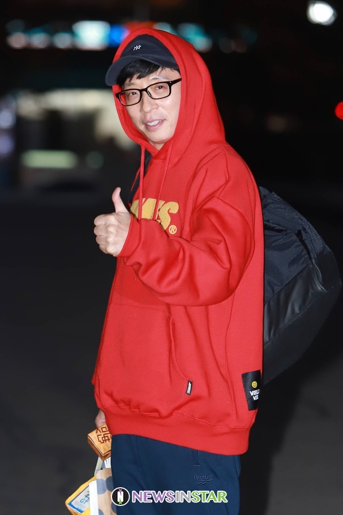 이날 유재석이 출근길에 포즈를 취하고 있다.