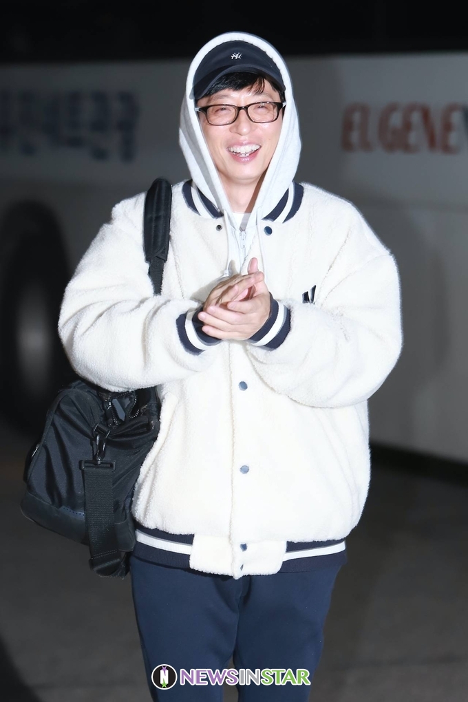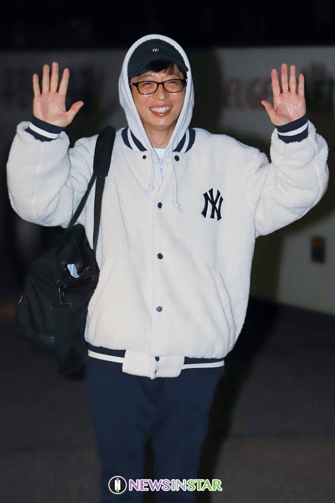 이날 유재석이 출근길에 포즈를 취하고 있다.