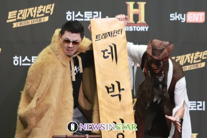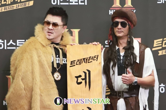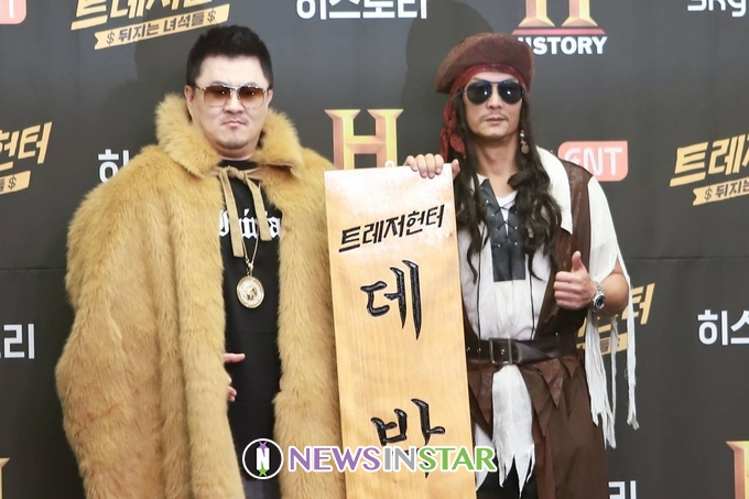 9일 오전 서울시 마포구 상암동 스탠포드호텔에서 히스토리채널의 국내 최초 흥정 예능프램 '트레저헌터' $뒤지는 녀석들$ 제작발표회가 열려 박준형, 데프콘이 포토타임을 갖고 있다.