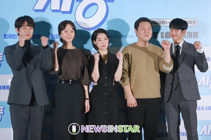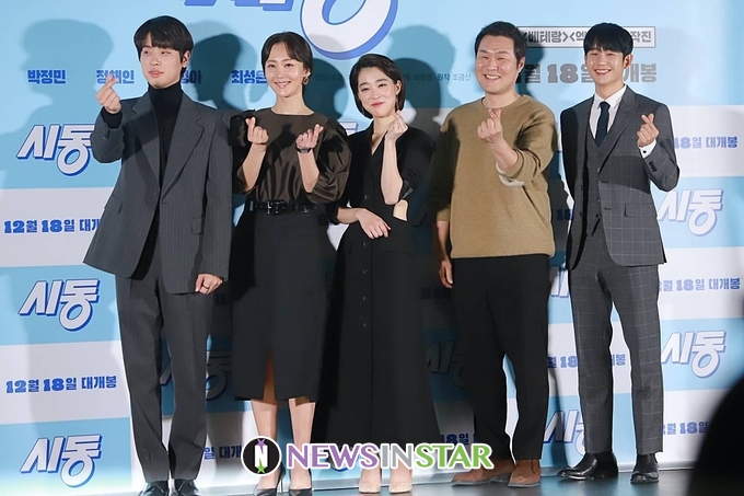 10일 오후 서울시 광진구 자양동 롯데시네마 건대입구에서 영화 '시동'의 언론 시사회가 열려 시사회 후 배우 박정민, 정해인, 염정아,  최성은, 윤경호가 포토타임을 갖고 있다.