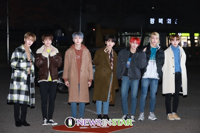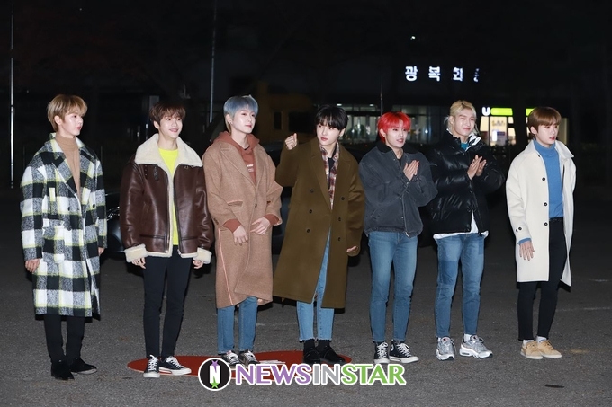12월 13일 오전 서울시 영등포구 여의도 KBS 신관 공개홀에서 열린 '뮤직뱅크' 리허설에 참석하기 위해 온리원오브(나인, 밀, 리에, 준지, 러브, 유정, 규빈)가 출근하고 있다.