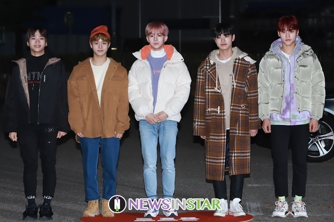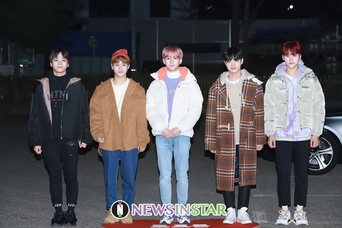 12월 13일 오전 서울시 영등포구 여의도 KBS 신관 공개홀에서 열린 '뮤직뱅크(‘MUSICBANK) 리허설에 참석하기 위해 MCND(민재, 캐슬제이, 윈, 빅, 휘준)가 출근하고 있다.