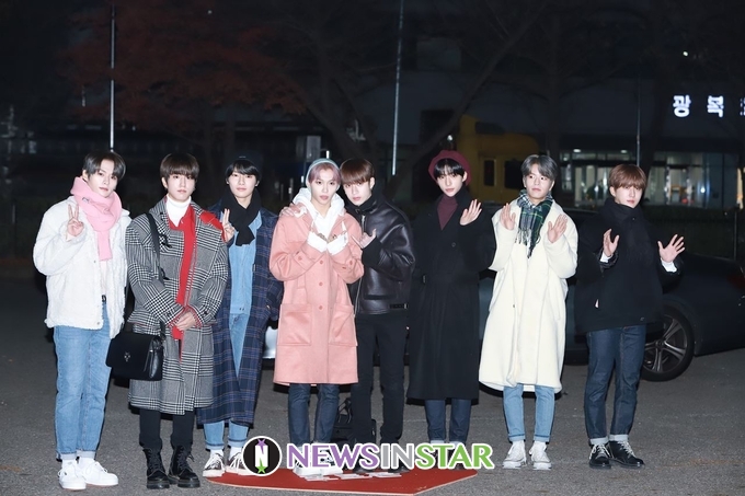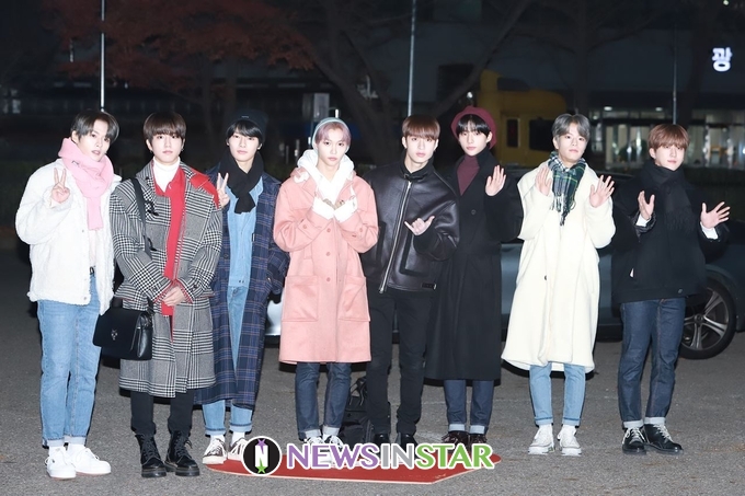 12월 13일 오전 서울시 영등포구 여의도 KBS 신관 공개홀에서 열린 '뮤직뱅크(‘MUSICBANK) 리허설에 참석하기 위해 스트레이 키즈(Stray Kids) 방찬, 리노, 창빈, 현진, 한, 필릭스, 승민, 아이엔이 출근하고 있다.