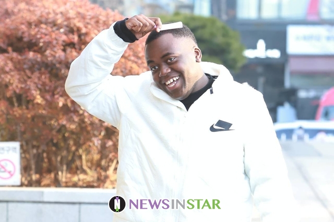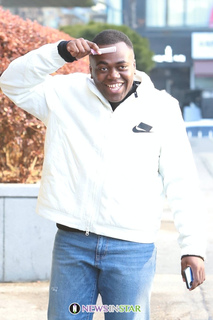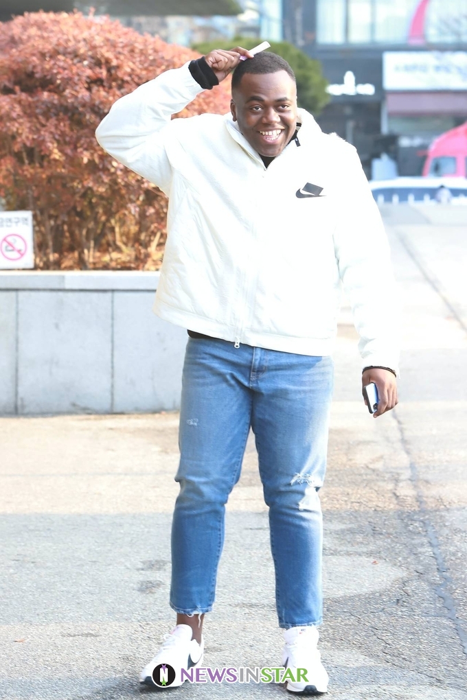 이날 조나단이 출근길에 포즈를 취하고 있다.