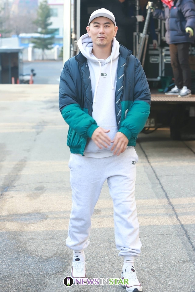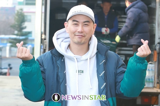 이날 문명진이 출근길에 포즈를 취하고 있다.