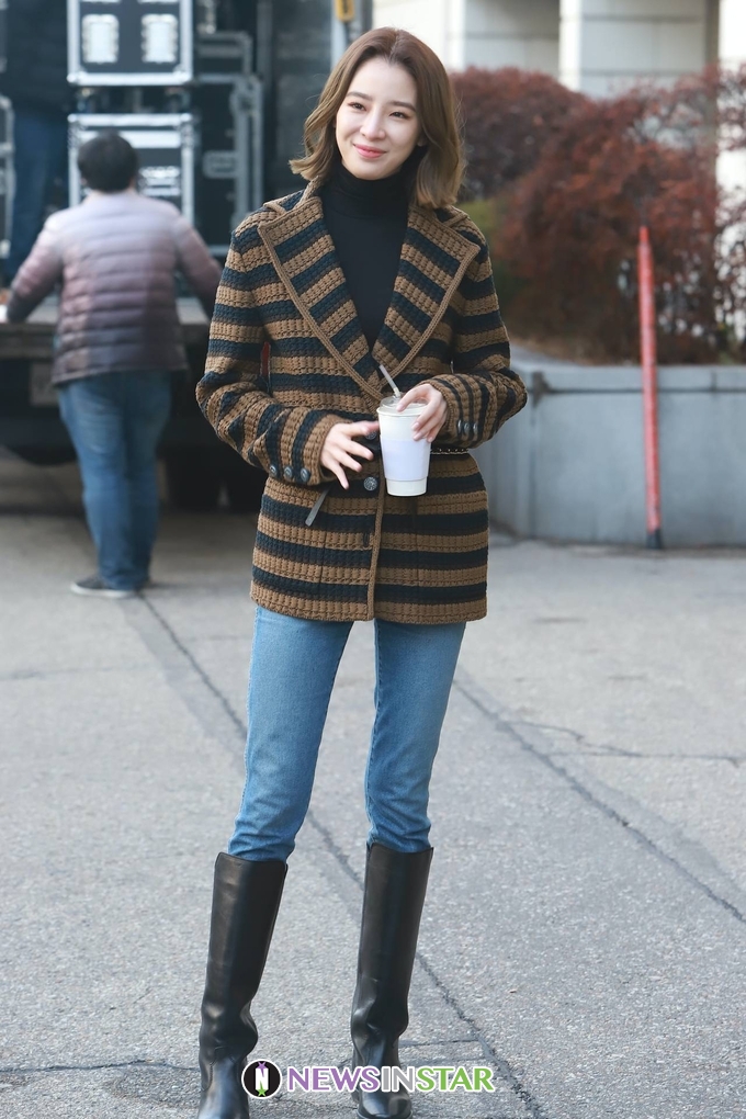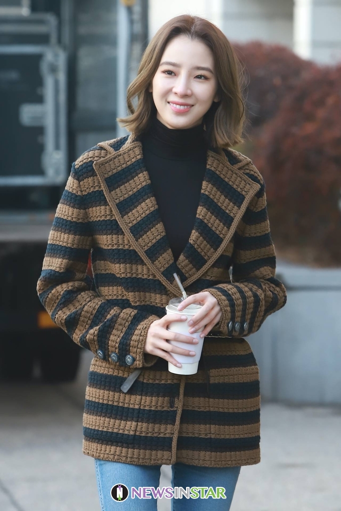 이날 아이린이 출근길에 포즈를 취하고 있다.