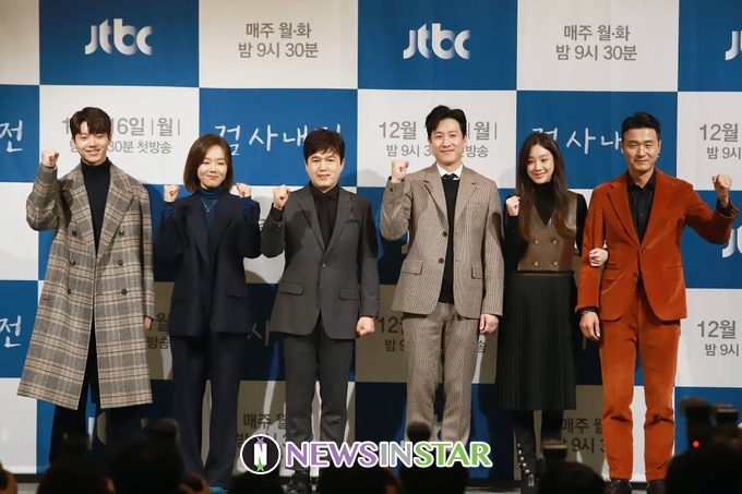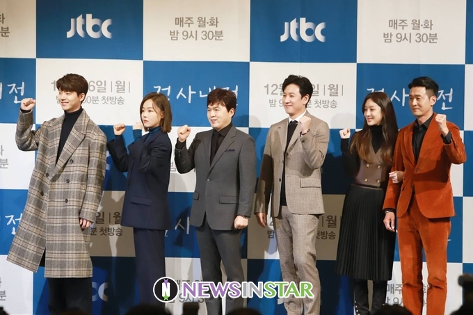 16일 오후 서울시 강남구 논현동 임피리얼팰리스서울 호텔에서 JTBC 새 월화드라마 '검사내전' 제작발표회가 열려 이선균X정려원X이성재X김광규X이상희X전우성 배우가 참석해 단체 포토타임을 갖고 있다.