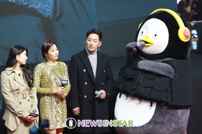 16일 오후 서울시 송파구 신천동 롯데월드몰에서 영화 '백두산' 레드카펫 쇼케이스가 열려 배우 이병헌, 하정우, 배수지, 전혜진과 EBS 연습생 펭수가 포토타임 행사를 갖고 있다.