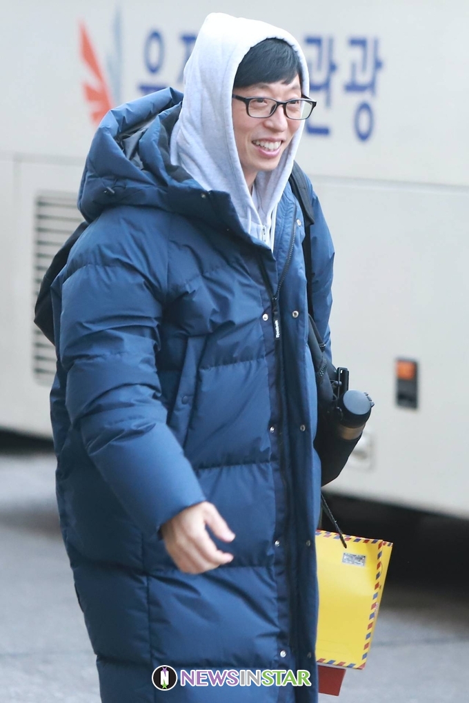 이날 유재석이 출근길에 포즈를 취하고 있다.