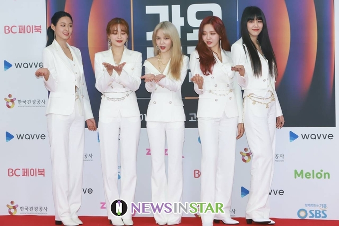 이날 포토월에서 AOA 지민, 유나, 혜정, 설현, 찬미가 참석해 포즈를 취하고 있다.