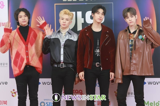 이날 포토월에서 엔플라잉(N.Flying) 이승협, 차훈, 김재현, 유회승가 참석해 포즈를 취하고 있다.