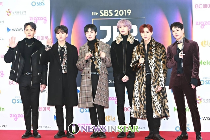 포토월에서 그룹 몬스타엑스(MONSTA X) 셔누, 민혁, 기현, 형원, 주헌, 아이엠이 참석해 포즈를 취하고 있다.