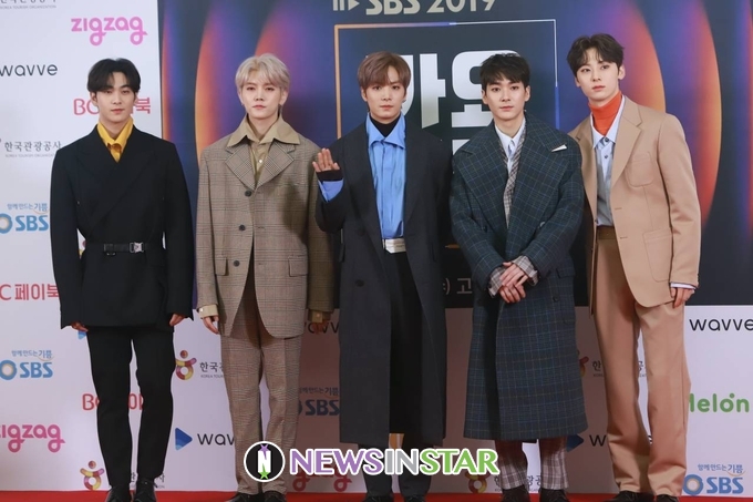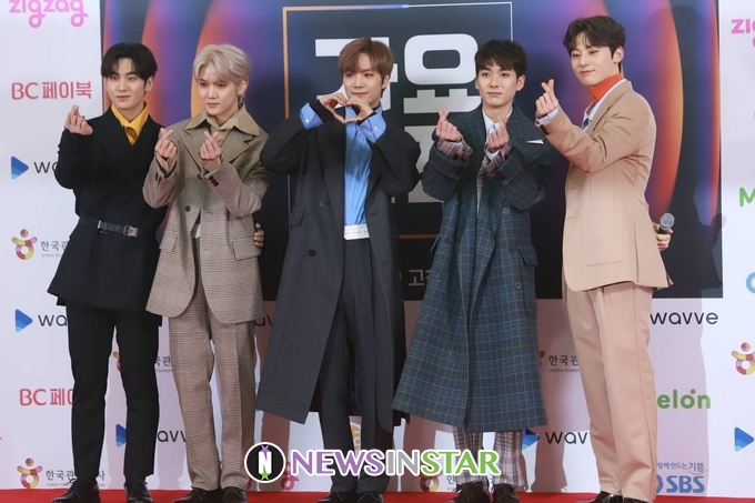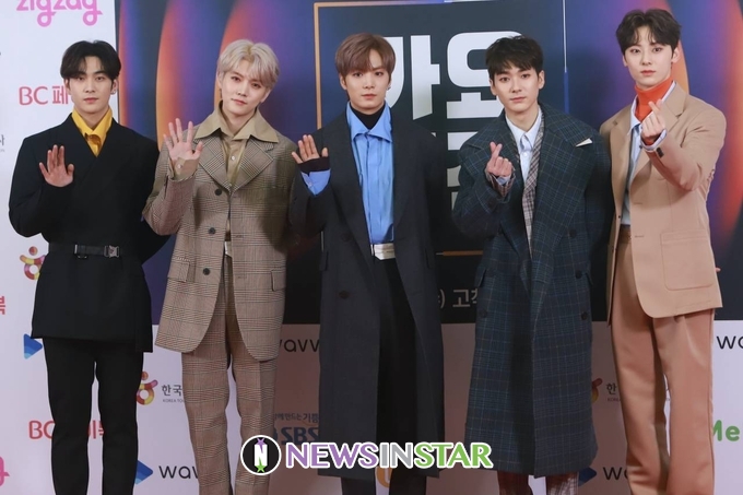 포토월에서 그룹 뉴이스트(NU'EST) JR, 아론, 백호, 민현, 렌이 참석해 포즈를 취하고 있다.
