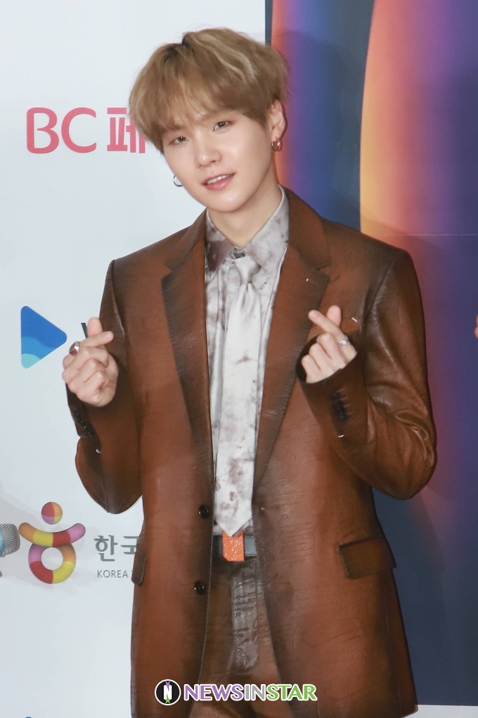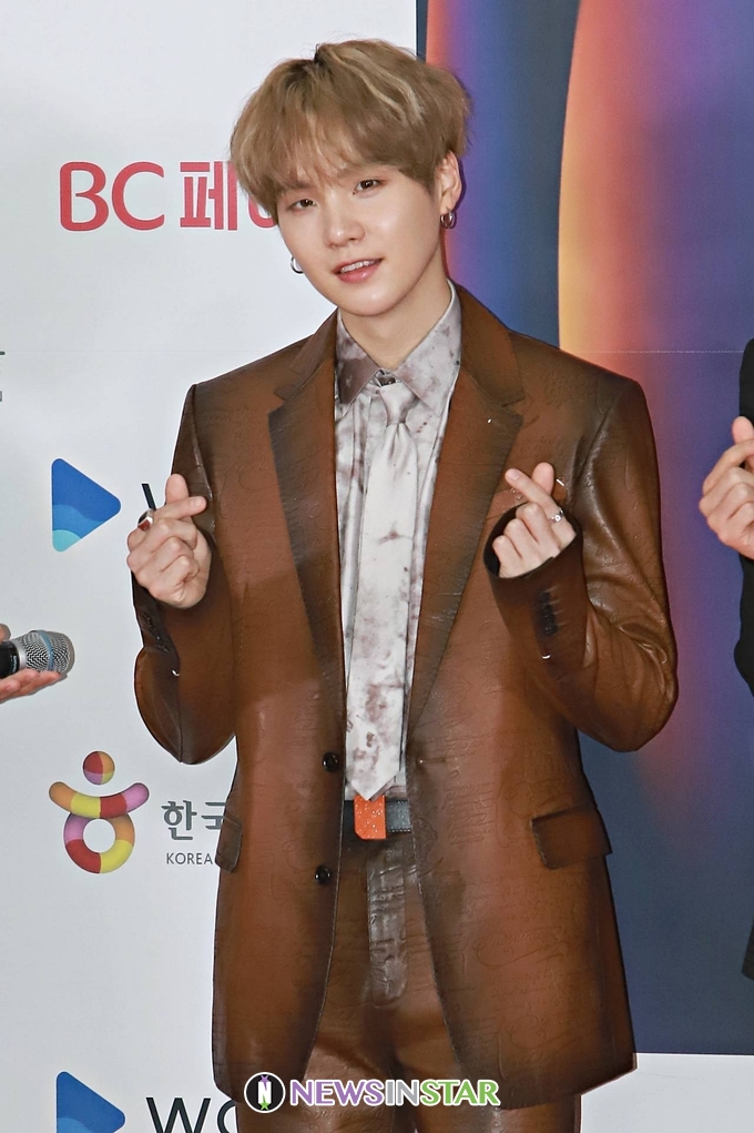포토월에서 그룹 방탄소년단(BTS)  슈가가 참석해 포즈를 취하고 있다.