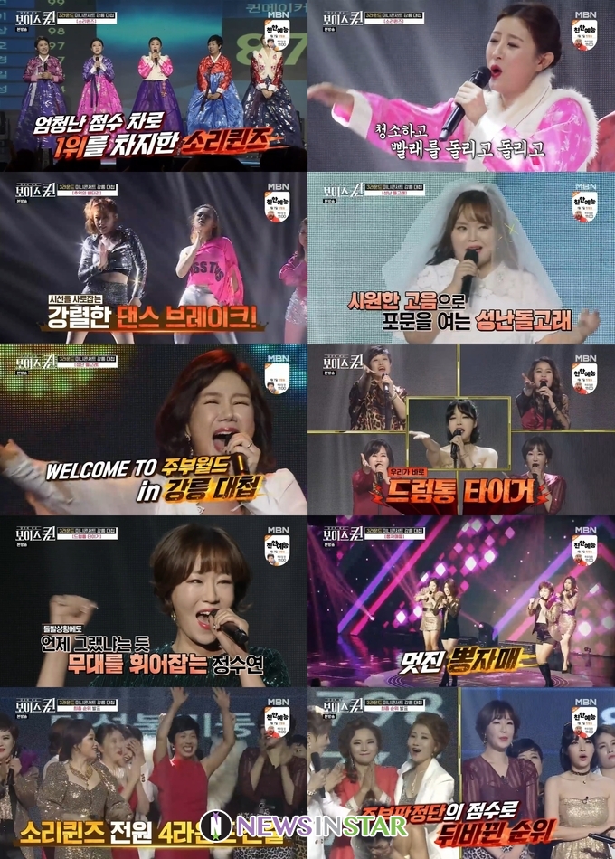 지난 방송에 이어 시작된 ‘소리퀸즈’(조엘라, 이미리, 전영랑, 박연희, 이유나)는 국악 최강자들이 모인 팀다운 판소리 무대로 관객을 압도했다. 우리 가락을 맛깔나게 들려준 ‘소리퀸즈’는 이어 주부들의 공감을 저격하는 개사로 ‘천태만상’을 불렀다. 집안일, 육아, 명절 스트레스에 “경력단절이 웬말이냐”라고 외치는 ‘소리퀸즈’의 센스 있는 개사는 강릉 주부판정단들의 어깨를 들썩이게 했다.